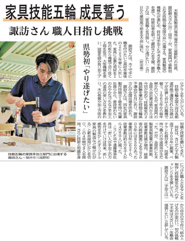 福井新聞に、福井県初『家具部門』で技能五輪に出場する弊社社員が掲載されました!!。 2025.10.10 10月10日の福井新聞に、福井県初の『家具部門』で技能五輪全国大会へ出場する、弊社の諏訪創大の記事が掲載されました。 今年入社の社員も技能五輪大会出場を目標とし、まずは技能検定3級合格を目指して頑張っています。